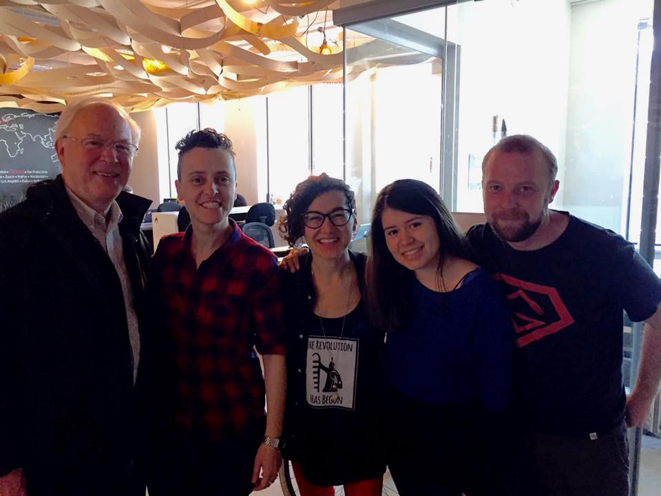 Manager of Programs and Partnerships at SiG Geraldine Cahill (second from left) and Executive Director of the 4Rs Youth Movement Jessica Bolduc (centre) at a project design meeting at Hub Ottawa.